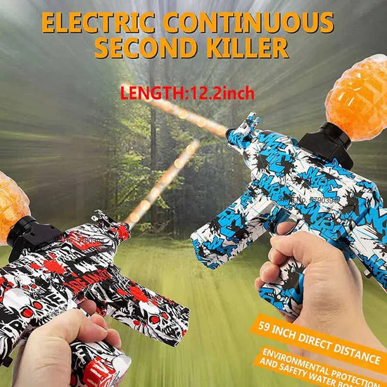 This Mini AK Gun style Rifle Gel Blaster delivers rapid fire fun with a safe gaming experience. Firing up to ten gel balls per second at 150 FPS, this Auto Rifle Orbeez Gun With Hopper Fed system keeps you in control of every skirmish. The compact design and graffiti finish make the Mini AK Gun an eye catching choice for kids and adults alike.
