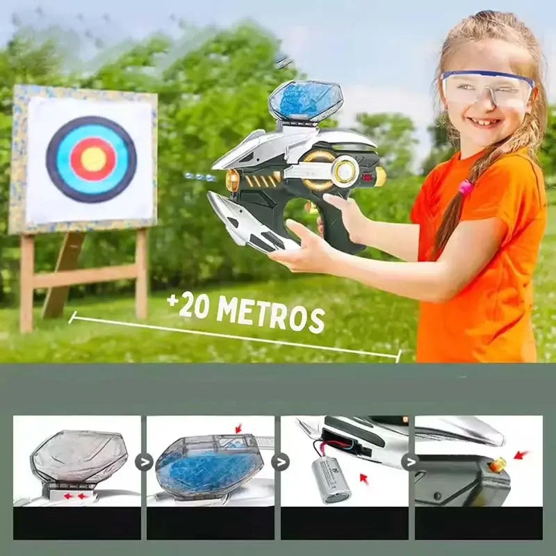 Step into the future with the Space Sentinel Sci‑Fi Gun a cutting‑edge Gel Blaster Pistol that lights up every shot. As a Pistol Orbeez Gun With LED Light it fires 7–8 mm gel balls out to 20 meters at up to 10 RPS. The integrated LED flash system and durable ABS construction make this Gel Blaster Pistol a standout in any battle.